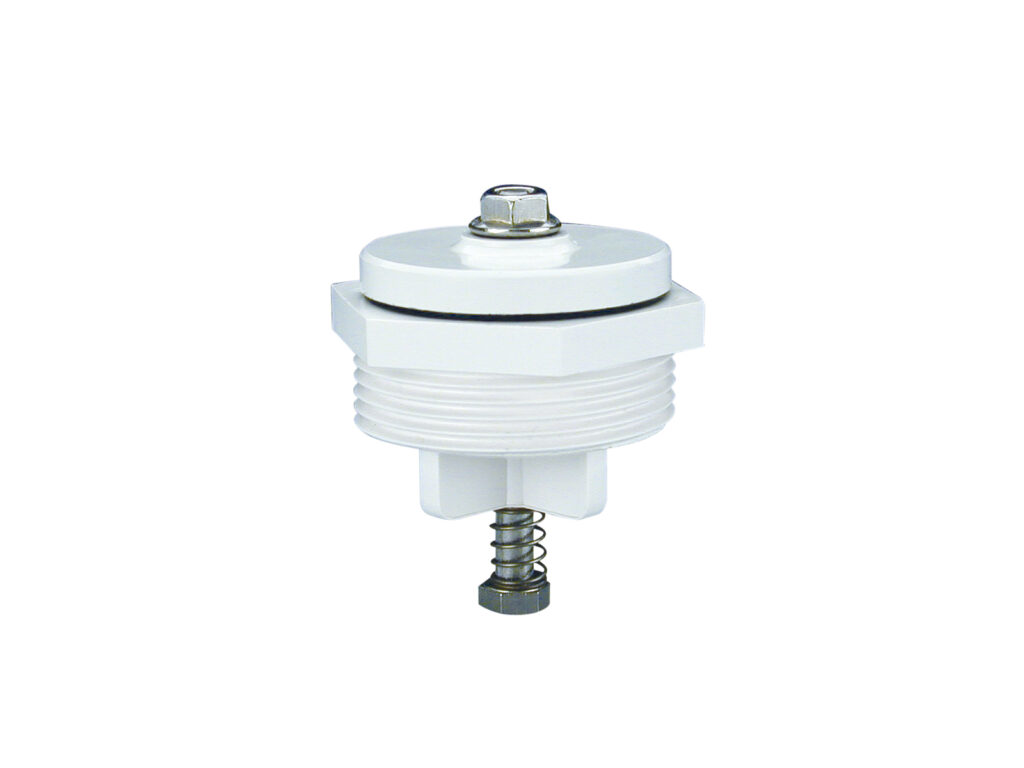 Válvula hidrostática para colocar en el fondo de los sumideros con salida 2″, construida en ABS blanco, con tornillo y muelle de inoxidable. Rosca macho 1 1/2″.
